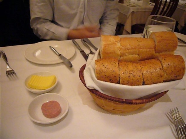 我們四個人各自點完餐之後,麵包籃當然就出現了,還可以一直續麵包,讓擔心吃法式料理會吃不飽的兩位帥哥們安心不少,剛加熱過的麵包脆脆的,加上有點鹹味的奶油吃,好吃啦!另外一盤粉紅色的是鵝肝醬,不過我吃不出來它好吃在那裡~
